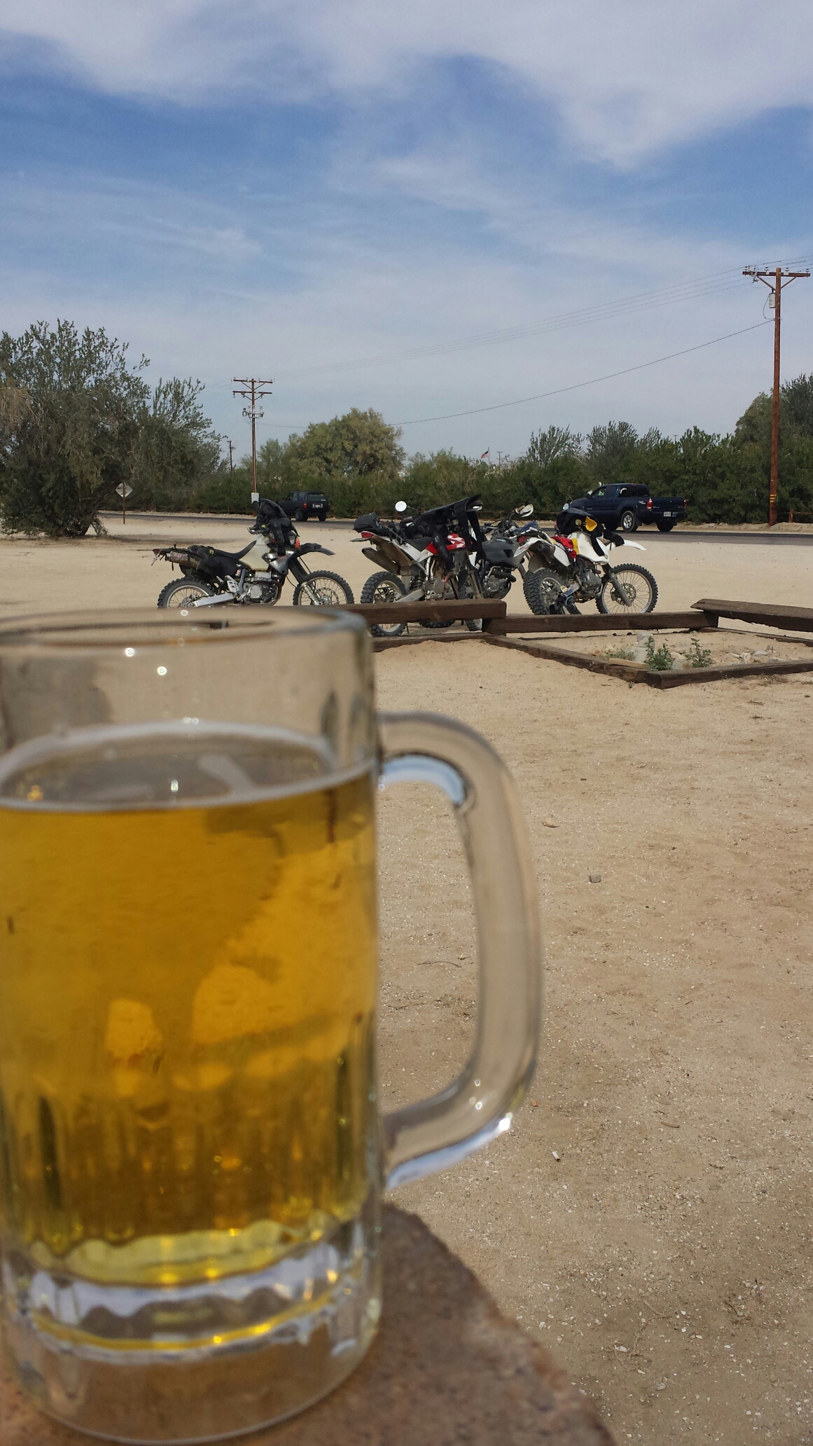 While talking at lunch Andy realized that his troubles he was having in the wash where do to his front tire, the knobs where starting to chunk off. So we came up with plan b, our own little adventure. We filled up the bikes and headed off to Ocotillo wells to get a new tire for Andy. When arriving Andy stayed to get the tire on and me and the rest of the crew headed around the corner to the Iron Door for some cold beer. Andy was done in record time and was able to join in for a round.